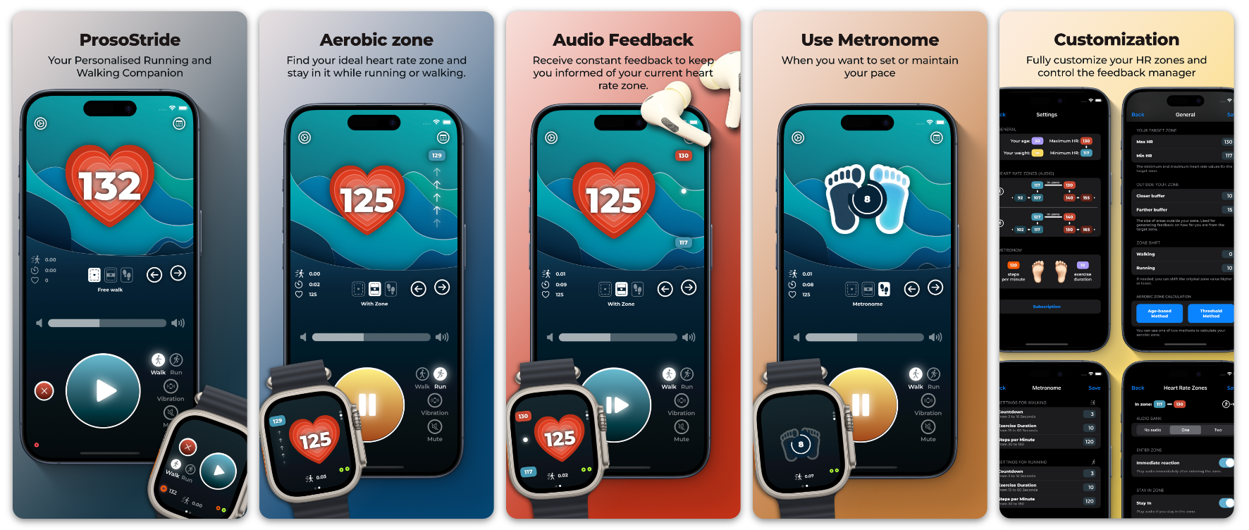 ProsoStride operates as a tandem between your iPhone and iWatch. Your iWatch provides heart rate data to the app and serves as a remote control, enabling you to switch modes on the go. The main app runs on your iPhone, generating audio feedback that blends seamlessly with whatever audio content you’re listening to.